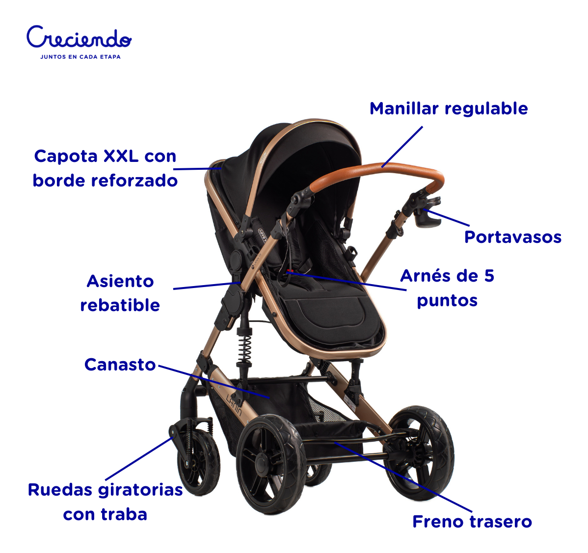 Cochecito de paseo travel system Mega Baby 3 en 1 Lanin Travel System negro con chasis color dorado